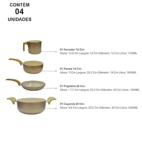 01 fervedor 12 cm: ideal para líquidos, chás e pequenas porções. Capacidade: 1100 ml. 01 panela 18 cm: perfeita para molhos, arrozes e preparos do dia a dia. Capacidade: 1800 ml. 01 frigideira 20 cm: antiaderente, ótima para omeletes, grelhados e refogados. Capacidade: 1000 ml. 01 caçarola 20 cm: versátil, excelente para sopas, ensopados e cozidos. Capacidade: 2400 ml.