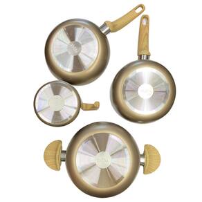Marca: alumínio nacional Material do revestimento interno: cerâmica premium gold antiaderente Material do corpo: alumínio de alta qualidade Material das alças/cabos: madeira ergonômica Cor: gold com vanilha