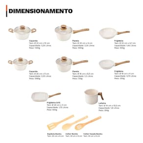 Distribuído por feheros shop Jogo de panelas completo 11 peças revestimento cerâmico premium indução Atenção As panelas com revestimento cerâmico oferecem propriedades antiaderentes, mas não são 100% antiaderentes. Para melhores resultados, recomenda-se o uso de pequenas quantidades de óleo ou . O revestimento cerâmico é uma alternativa saudável e ecológica, pois não libera substâncias tóxicas quando aquecido. - panelas premium com certificação inmetro nível a - não deixe a chama do fogão pegar nas laterais das panelas - leia atentamente a descrição e siga as recomendações do fabricante Informações do produto - versatilidade incrível: compatível com fogões a gás, elétrico, vitrocerâmico e de indução - durabilidade excepcional: revestimento cerâmico resistente a arranhões e abrasões - cozinha saudável: livre de pfoa e ptfe, ideal para quem busca mais saúde - design premium: acabamento moderno e elegante que facilita a limpeza - economia de tempo e energia: aquece rápido e distribui o calor de forma uniforme - conjunto completo: 11 peças para preparar diversas receitas com praticidade Especificações técnicas - compatível com fogões a gás, elétricos, vitrocerâmicos e de indução - revestimento cerâmico em 3 camadas com espessura de 4 mm - cabo de baquelite com revestimento soft touch, confortável e seguro - permite cozinhar com menos óleo graças ao revestimento antiaderente cerâmico - livre de pfoa e classificado como nível a no inmetro - fundo triplo com indução: estrutura em alumínio com cerâmica, economia de energia - composição de revestimento: 2 camadas cerâmicas + 1 camada resistente a alta temperatura Ficha técnica do produto - panela 16 cm: d 16 cm x a 8,5 cm c 1300 ml p 730 g - panela 20 cm: d 20 cm x a 9 cm c 2250 ml p 1050 g - caçarola 20 cm: d 20 cm x a 9 cm c 2250 ml p 1080 g - caçarola 22 cm: d 22 cm x a 10 cm c 3250 ml p 1350 g - leiteira 14 cm: d 14 cm x a 10,5 cm c 2000 ml p 350 g - frigideira 18 cm: d 18 cm x a 4 cm c 750 ml p 300 g - frigideira 22 cm: d 22 cm x a 4,7 cm c 1450 ml p 500 g - frigideira grill 24cm: 24 cm x 24 cm a 3 cm p 600g - espátula vazada de bambu: 30 x 6 x 1 cm - colher vazada de bambu: 30 x 6 x 1 cm - colher para arroz de bambu: 30 x 6 x 1 cm Importante: d= diâmetro, a= altura, c= capacidade, p= peso Antes do primeiro uso - lave com esponja macia e detergente - seque com pano de prato - aplique um pouco de óleo na parte interna - leve ao fogo baixo por 2 minutos - desligue o fogo e espere esfriar - lave novamente e seque Após o uso - evite choques térmicos. Deixe esfriar antes de lavar - lave à mão com água morna, esponja macia e detergente - enxágue e seque com pano macio - para alimentos queimados, deixe de molho e use materiais não abrasivos - não utilize utensílios metálicos, objetos afiados ou produtos abrasivos Itens inclusos no pacote - 01 panela 16 cm com tampa de vidro - 01 panela 20 cm com tampa de vidro - 01 caçarola 20 cm com tampa de vidro - 01 caçarola 22 cm com tampa de vidro - 01 leiteira 14 cm - 01 frigideira 18 cm - 01 frigideira 22 cm - 01 frigideira grill quadrado 24cm - 01 espátula vazada de bambu - 01 colher vazada de bambu - 01 colher para arroz de bambu Todas as fotos são reais dos produtos. Qualquer dúvida, estamos à disposição Dúvidas frequentes 01- o produto pode ir ao forno R: não, estes modelos não são adequados para uso no forno devido ao cabo em baquelite. 02- o produto é novo Possui R: sim, o produto é novo e possui de 3 meses conforme as normas do fabricante. 03- é compatível com fogão de indução R: sim, possuem fundo especial que permite o uso em fogões de indução, além de fogões a gás, elétricos e vitrocerâmicos.