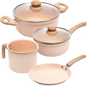 É composto por uma caçarola, uma panela com cabo, uma frigideira e uma leiteira, todos em alumínio com revestimento cerâmico na cor bege.