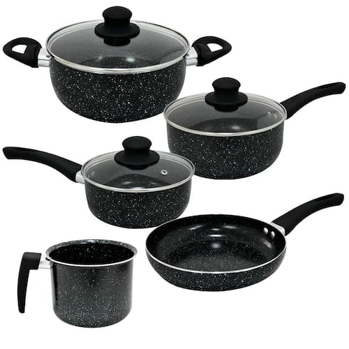 É composto por uma caçarola, duas panelas com cabo, uma frigideira e uma leiteira, todos em alumínio com revestimento cerâmico na cor preta e granilites brancos.