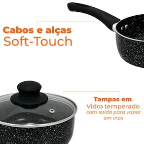 As peças do conjunto possuem cabos e alças com acabamento siliconado Soft-Touch na cor preto, que dão um toque macio e não esquentam, evitando acidentes.