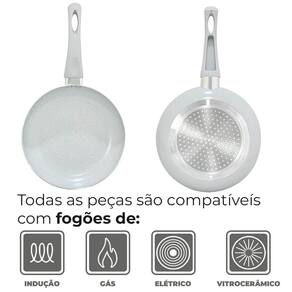 É composto por duas caçarolas, duas panelas com cabo e uma frigideira, todos em alumínio com revestimento cerâmico na cor cinza com granilite branco.