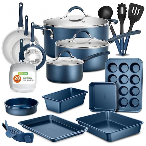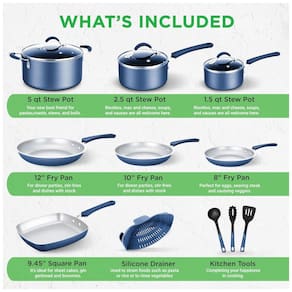 REVESTIMENTO ANTI ADERENTE O conjunto de panelas antiaderente sem PTFE, PFOA, PFOS apresenta um revestimento antiaderente de longa duração para fácil liberação ou lançamento de alimentos, limpeza e cozimento saudável com exterior de laca resistente ao calor, tornando o resistente a altas temperaturas. Pegas de alça de toque frio o conjunto de panelas apresenta alças ergonômicas e resistentes ao calor de toque frio, garantindo um cozimento confortável e . Oferece design metálico elegante com bordas de aço inoxidável polido anti riscos, adicionando um toque elegante às panelas e frigideiras. TAMPAS TRANSPARENTES As panelas antiaderentes seguras para forno são equipadas com tampas transparentes de vidro temperado com orifícios de ventilação que permitem a saída do vapor. O conjunto de panelas seguras para lava louças distribui e retém o calor de forma eficaz para cozinhar uniformemente com temperatura máxima de 260C. PRONTO PARA INDUÇÃO As panelas e frigideiras são seguras para uso em fogões a gás, elétricos, cerâmicos e de indução. Feito de alumínio prensado reforçado com 18 25um, espessura de revestimento multicamadas de 2,. Inclui utensílios de silicone de nylon sem arranhões