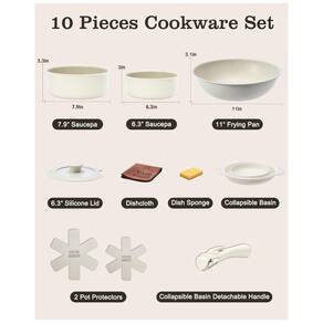1x frigideira antiaderente de 28 cm 1x panela de 20 cm 1x panela de 16 cm 1x alça removível 1x tampa de vidro de 16 cm 1x pano de limpeza 2x tapetes de esponja 1x bacia de prato dobrável 1x esponja de prato