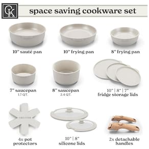 Organização Perfeita: Com nosso conjunto de utensílios de cozinha empilháveis e alça removível, você poderá organizar seus armários de forma eficiente, sem abrir mão dos itens essenciais para o preparo das suas receitas. Versatilidade Máxima: As alças removíveis garantem total flexibilidade, permitindo que você transfira os utensílios com facilidade entre o fogão, o forno, a mesa e a geladeira. Revestimento Antiaderente de Granito Seguro e Exclusivo: Nossa tecnologia patenteada oferece um revestimento antiaderente de granito livre de substâncias químicas prejudiciais, como PFOS e PFOA, proporcionando segurança e durabilidade no uso diário. Resistência ao Forno: Os utensílios podem ser levados ao forno em temperaturas de até 250°C, ampliando suas possibilidades na cozinha, seja para assar ou gratinar, e facilitando a limpeza.