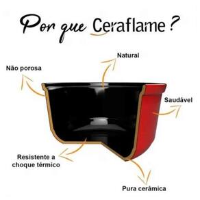 • Informações Adicionais: Totalmente atóxica; Mantém o calor por mais tempo; 100% Resistente a choques térmicos; Não é porosa, não mancha e não risca; Pode ser levada ao fogão a gás e elétrico, ao micro-ondas, forno convencional, geladeira e lava-louças; Atenção: Ceraflame é um produto feito a mão, por isso pode apresentar pequenas saliências em sua superfície; Não utilizar em fogões de indução; A tampa de vidro não pode ser usada no forno e no micro-ondas; Não possui revestimento antiaderente;