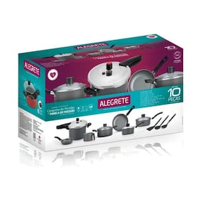 Jogo De Panelas Enjoy Com Panela 10pçs Cinza Praticidade, segurança e estilo na sua cozinha Produzido em alumínio com revestimento antiaderente de alta qualidade, o conjunto inclui panela , frigideiras, caçarola, fervedor e utensílios de nylon. Ideal para o dia a dia, com cabos anatômicos e tampa de vidro. Design moderno na cor cinza. Eles evitam riscos na superfície antiaderente. Evite superaquecimento: Nunca aqueça as panelas vazias. Mantenha-as no fogo apenas durante o cozimento dos alimentos. Proteja cabos e alças: Evite expor cabos e alças diretamente à chama do fogão, pois isso pode danificar os materiais. Limpeza correta: Use somente a parte amarela da esponja para lavar, preservando o revestimento antiaderente. Praticidade: Produto compatível com lava-louças, facilitando ainda mais a limpeza. Conjunto 10 Peças - Enjoy Alegrete Este conjunto completo foi pensado para facilitar sua rotina na cozinha, unindo praticidade, qualidade e design moderno. Acompanha: 01 Panela com tampa 16 cm 01 Panela com tampa 18 cm 01 Caçarola com tampa 20 cm 01 Fervedor 12 cm 01 Frigideira francesa 20 cm 01 Frigideira francesa 14 cm 01 Panela 4,5L 01 Espátula de nylon 01 Escumadeira de nylon 01 Colher de nylon Marca: Não Informado