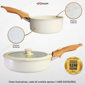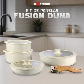 Jogo de Panelas Fusion Duna Extream - Cabo SmartClick e Compatível com Fogão de InduçãoO Kit de Panelas Fusion Duna Extream chegou para revolucionar sua cozinha Com um design sofisticado na cor Duna Bege , este conjunto de 10 peças traz praticidade, inovação e eficiência para o seu dia a dia.Funciona em Fogão por InduçãoO Kit Fusion Duna Extream é totalmente compatível com fogões de indução, além de ser ideal para uso em fogões a gás, elétricos e vitrocerâmicos.Destaques do Produto:- Cabo Destacável SmartClick - Mais praticidade e segurança Facilita o armazenamento, economiza espaço e permite levar as panelas diretamente do fogão ao forno ou à mesa.- Tampas de Plástico para Armazenamento Inteligente - Guarde as sobras das refeições diretamente na panela, mantendo os alimentos frescos por mais tempo.- Revestimento UltraShield Nano Ceramic Antiaderente - Tecnologia cerâmica avançada que impede que os alimentos grudem, tornando o preparo mais saudável e facilitando a limpeza.- Alumínio de Alta Performance - Proporciona um cozimento uniforme, rápido e eficiente.- Versatilidade Total - Use no fogão, no forno sem o cabo , na geladeira e até na mesa para servir com estilo.Itens Inclusos no Kit:1 Frigideira 20cm1 Frigideira Alta 26cm1 Panela 18cm1 Panela 20cm3 Utensílios de Cozinha1 Cabo Destacável SmartClick1 Tampa Plástica 18cm1 Tampa Plástica 20cmAposte na praticidade do cabo destacável, no armazenamento inteligente e na compatibilidade com fogões por indução