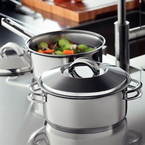 Capacidade da Panela: Caçarola Funda 3,60L; Panela 1,40L; Cozi-vapore 2,20L; Caçarola Rasa 2,90L; Frigideira 1,30L