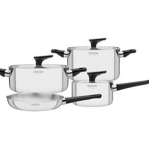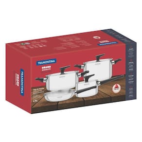 O Jogo De Panelas Grano Baquelite Tramontina 4 Peças é ideal para completar a sua cozinha com itens que deixaram sua rotina mais prática. As panelas Tramontina são produzidas com materiais de excelente qualidade, pensando sempre na saúde e bem estar da sua família.________________Jogo de Panelas Grano Baquelite Tramontina com Corpo Triplo Cabos e Alças 4 PeçasDescrição:Produzidas com a durabilidade do aço inox, não soltam resíduos, além de possuírem corpo triplo (aço inox + Alumínio + aço inox), que distribui o calor uniformemente, proporcionando um cozimento mais rápido. Por isso, você pode manter o fogo baixo durante todo o preparo e, assim, poupar energia.  O jogo ainda proporciona um manuseio mais confortável por possuir cabos e pegadores em baquelite, antitérmico que não aquece. Podem ser usadas em fogões a gás, elétrico, vitrocerâmico e indução.Composição:1 - Caçarola Rasa Tramontina Grano Baquelite em Aço Inox com Corpo Triplo (Código 62163240).1  Caçarola Tramontina Grano Baquelite Funda em Aço Inox Fundo Triplo (Código 62164200).1  Frigideira Tramontina Grano Baquelite em Aço Inox com Corpo Triplo (Código 62175260) .1  Panela Tramontina Grano Baquelite em Aço Inox com Corpo Triplo (Código 62161160).Como usar o produtoUse uma fonte de calor brando para evitar que o alimento grude no fundo da caçarola. O fundo triplo distribui uniformemente o calor, não sendo necessário o fogo alto. E, além disso, você economiza energia.Quando a caçarola for utilizada no fogão a gás, a chama não deve ultrapassar a base da caçarola. No caso de uso de chapa elétrica, a chapa deverá ter diâmetro igual ou inferior ao da caçarola.Não aqueça o alimento colocando uma caçarola do mesmo diâmetro sobre a outra. Esse procedimento é perigoso, pois cria vácuo e impossibilita a retirada do mesma.Se a tampa da caçarola de aço inox Tramontina ficar presa pelo efeito do vácuo durante o resfriamento, basta puxar ou aquecer novamente até neutralizar o efeito do vácuo.As alças de inox aquecem durante o cozimento. Aconselhamos o uso de luvas durante o manuseio.Alguns alimentos que possuem amido poderão deixar manchas na parte interna da caçarola durante o cozimento. Para remover facilmente as manchas, passe um pano umedecido com suco de limão ou vinagre, ou use a Pasta para Polir e Remover Manchas Tramontina. Não deixe a caçarola vazia sobre uma fonte de calor. Deixe caçarolas quentes somente em superfícies resistentes ao calor.Descrição técnica:Por ser feita de aço inoxidável, a panela Tramontina não libera nenhum tipo de resíduo nas suas receitas.Pode ser usada em qualquer tipo de fogão: gás, elétrico, vitrocerâmico e indução. Ainda possui tampa com saída de vapor e encaixe perfeito. Cabo e pegador em baquelite, não aquecem, com protetor de chamas, evitando que queimem quando a chama não estiver centralizada no fundo da panela.Economiza tempo e energia: o segredo está no corpo triplo (aço inox + Alumínio + aço inox), que distribui o calor uniformemente, proporcionando um cozimento mais rápido. Especificação técnica:EAN13: 7891116161234DUN14: 17891116161231NCM: 7323.93.00Peso Líquido: 5,7800 kg.Peso Bruto: 6,8650 kg.Metragem: 0,036281 m³.Sobre a TramontinaA Tramontina é reconhecida como referência de qualidade em mais de 120 países, apoiando na inovação, no design, na tecnologia e no valor do capital humano para cumprir uma missão indelegável: gerar valor ao consumidor nas mais diversas fronteiras, culturas, épocas e ocasiões.