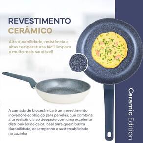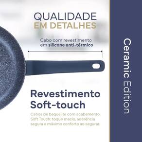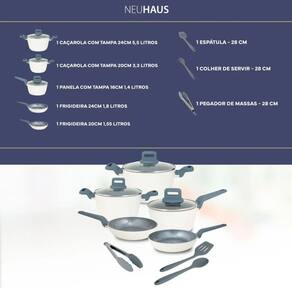 O kit completo é composto por duas caçarolas com tampa (24 cm e 20 cm), uma panela com tampa (18 cm), duas frigideiras (24 cm e 20 cm) e três utensílios em silicone espátula, colher e pegador de massas que ajudam a preservar o revestimento das panelas. Os cabos e alças são revestidos com material macio ao toque e resistentes ao calor, proporcionando segurança e conforto no manuseio.
