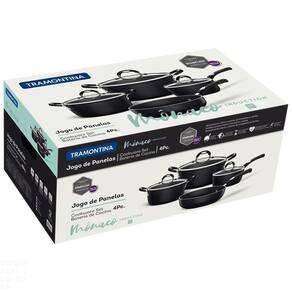 O Jogo de Panelas Tramontina Mônaco Induction em Alumínio com Revestimento Interno e Externo Antiaderente Starflon Premium Preto 4 Peças é a escolha ideal para quem preza por utensílios de alta qualidade em sua cozinha! Suas peças tem corpo produzido em alumínio com espessura de 3 milímetros que proporciona um cozimento rápido e uniforme dos alimentos. Seu revestimento interno e externo é em antiaderente Starflon Premium, que não gruda, é fácil de limpar, mais durável e não é prejudicial a sua saúde e da sua família. Suas panelas e caçarola acompanham tampa de vidro temperado com borda de aço inox e saída de vapor que auxilia no preparo dos alimentos e facilita a visualização. Seus cabos, alças e pegadores metálicos contam com proteção de silicone que reduz a propagação de calor, garantindo um manuseio muito mais seguro e confortável. As peças ainda são fáceis limpar e podem ir à máquina de lavar louças, facilitando seu dia a dia. Com a Tramontina, você tem o melhor para equipar sua casa!OrientaçõesCorpo de alumínio com espessura de 3,0 mm que proporciona cozimento rápido e uniforme.