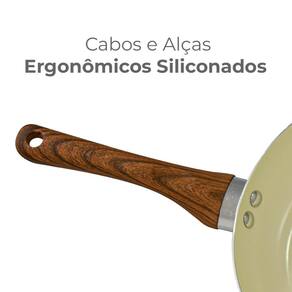 O conjunto é composto por 6 peças na cor prata com alças e cabos com design de madeira. São duas caçarolas, duas panelas com cabo, uma frigideira e uma leiteira, um kit completo que facilitará o cozimento no dia a dia.