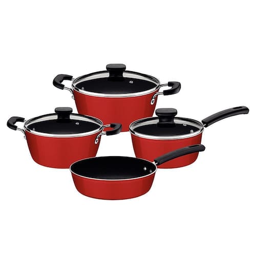 A panela e as caçarolas vem com tampas de vidro temperado com saídas de vapor e bordas de aço inox e todos os itens do jogo tem acabamento externo em poliéster e cabos, alças e pegadores baquelite antitérmico, material que reduz a propagação de calor e proporciona um manuseio muito mais seguro e confortável. Além de todas essas vantagens, o jogo pode ir à máquina de lavar louças, facilitando suas tarefas na cozinha