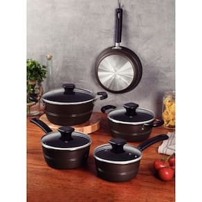 O jogo de panelas Tramontina Sicília em alumínio com revestimento interno e externo antiaderente Starflon Excellent avelã 5 peças vai garantir uma cozinha equipada com utensílios de alta qualidade e eficiência! Suas peças são produzidas em alumínio com revestimento interno e externo de antiaderente Starflon Excellent, características que proporcionam o cozimento uniforme dos alimentos, evita que eles grudem em sua superfície e as torna mais duráveis. Suas panelas e caçarolas vem com tampa de vidro temperado com saída de vapor e borda de aço inox e seus cabos, alças e pegadores são em material antitérmico e garantem um manuseio muito mais confortável e seguro. Elas ainda são fáceis de limpar e podem ir à máquina de lavar louças, otimizando sua rotina na cozinha!
