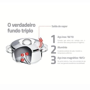 - Economiza tempo e energia: o segredo está no fundo triplo (aço inox + alumínio + aço inox), que distribui o calor uniformemente, proporcionando um cozimento mais rápido. Por isso, você pode manter o fogo baixo durante todo o preparo e, assim, poupar energia. Além disso, a panela toda em aço inox pode ir ao forno para gratinar ou finalizar pratos, na temperatura máxima de 260C.