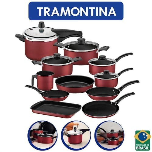 Seja qual for a receita que você vai preparar, é essencial contar com itens de qualidade, como o jogo de panelas Tramontina Turim em alumínio com revestimento interno e externo em antiaderente Starflon Max vermelho 10 peças.