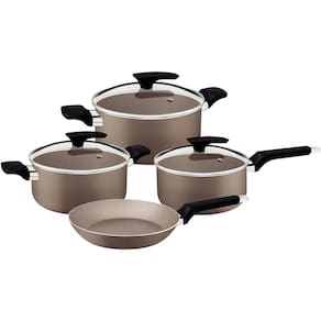 O Jogo de Panelas Tramontina Alumínio Milazzo Amêndoas 4 Peças combina praticidade, segurança e elegância para sua cozinha. Com revestimento interno e externo antiaderente Starflon Max, é fácil de limpar, resistente e seguro para a saúde, pois é livre de PFOA. Suas tampas de vidro temperado com borda de aço inox permitem acompanhar o preparo sem perder calor, enquanto as alças e cabos de baquelite antitérmico com acabamento soft-touch garantem conforto no manuseio. Compatível com fogões a gás, elétricos e vitrocerâmicos, oferece versatilidade para qualquer preparo. Características: Marca: Tramontina Código do Fabricante: 28599460 Linha: Milazzo Cor: Amêndoas Material: Alumínio Material da Tampa: Vidro temperado Material Pegadores: Nylon Material Alças/Cabos: Baquelite antitérmico Antiaderente: Sim Fogões Compatíveis: Gás, elétricos e vitrocerâmicos Conteúdo: 1 Caçarola 20cm 2.9L, 1 Caçarola 24cm 4.9L, 1 Frigideira 24cm 1.2L e 1 Panela 18cm 2.1L Compatível com Micro-ondas: Não Compatível com Lava-louças: Não Pode ir ao Forno: Não Saída de vapor: Sim Livre de PFOA: Sim Marca: Não Informado