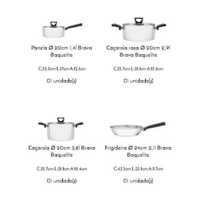 O jogo inclui 1 caçarola rasa 20cm (2,9l), 1 caçarola 20cm (3,6l), 1 frigideira 24cm (2,1l) e 1 panela 20cm (1,4l).
