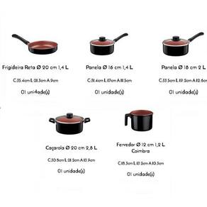 CONTEÚDO DO JOGO - 01 Frigideira Reta 20 cm 1,4 L. Ref. 27815353; - 01 Panela 16 cm 1,4 L. Ref. 27815354; - 01 Panela 18 cm 2 L. Ref. 27815355; - 01 Caçarola 20 cm 2,8 L. Ref. 27815356; - 01 Fervedor 12 cm 1,2 L Coimbra. Ref. 27815712.