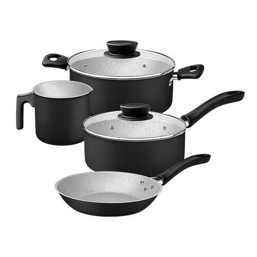 Especificações Gerais do Produto: Pegador / Cabo: Baquelite Antitérmico e Nylon Dimensões AxLxP (mm): Caçarola Ø 18cm; Fervedor Ø 12cm; Frigideira Ø 18cm; Panela Ø 16cm Cor: Preto Material: Alumínio e baquelite Garantia: 90 dias junto ao fabricante Referência: 28299004 Tecnologia da Panela: Starflon Max Pode ir à Máquina de Lavar Louças?: Sim Capacidade da Panela: Caçarola 2L; Fervedor 1,1L; Frigideira 0,6L; Panela 1,4L Linha: Linz Revestimento Interno: Antiaderente Tipo de Fogão: Gás, elétricos e vitrocerâmicos (resistência elétrica) Tampa: Panela e caçarola: sim, de vidro com saída de vapor