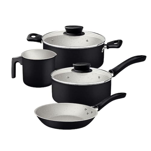 Corpo de alumínio com espessura que proporciona cozimento rápido e uniforme.Revestimento interno e externo de antiaderente Starflon Max que não gruda, é fácil de limpar, mais durável e não é prejudicial à saúde, pois é livre de PFOA.Tampas de vidro temperado com bordas de aço inox.Cabos, alças de baquelite antitérmico e pegadores de nylon que oferecem segurança durante o manuseio.Podem ir à máquina de lavar louças facilitando seu dia a dia.Pode ser utilizada nos fogões: gás, elétrico e vitrocerâmico : resistência elétrica.