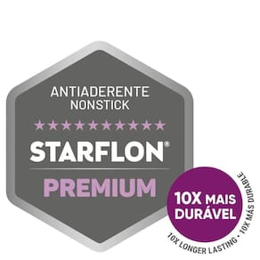 Mais Informações - Corpo de alumínio com espessura que proporciona cozimento rápido e uniforme.Revestimento interno e externo de antiaderente Starflon Premium que não gruda, é fácil de limpar, mais durável e não é prejudicial à saúde, pois é livre de PFOA.Tampas de vidro temperado, com saída de vapor e borda de aço inox.Cabos, alças e pegadores metálicos com proteção de silicone que proporcionam redução da propagação de calor, aumentando a segurança e melhorando a empunhadura.Podem ir à máquina de lavar louças facilitando seu dia a dia.