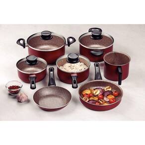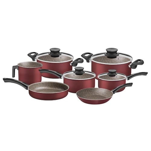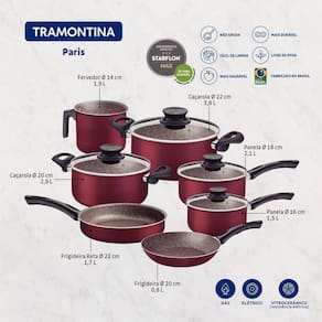 O Jogo de Panelas Tramontina Paris Texture em Alumínio com Revestimento Interno e Externo Antiaderente Starflon Max Vermelho 7 Peças tem itens especiais para o sucesso das suas tarefas na cozinha! Ele tem peças produzidas em alumínio com revestimento interno e externo antiaderente Starflon Max, atributos que proporcionam o cozimento uniforme dos alimentos e evita que eles grudem em suas superfícies. Suas panelas e a caçarola possuem tampas de vidro temperado com bordas em aço inox e seus cabos e alças são em baquelite antitérmico, o que proporciona um manuseio seguro e confortável. Além disso, é um jogo fácil de limpar e que pode ir à máquina de lavar louças. Com a Tramontina, você tem o melhor para equipar sua cozinha!