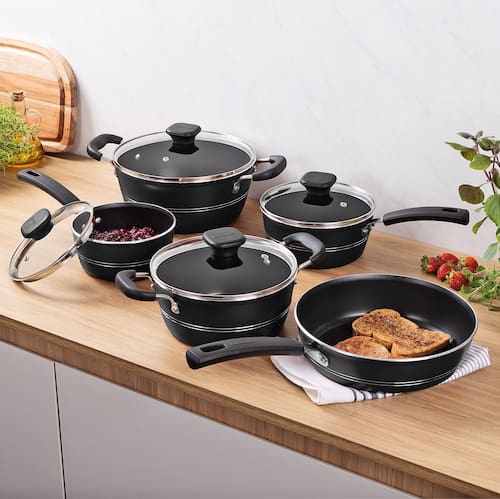 As panelas e caçarolas acompanham tampas de vidro temperado com bordas em aço inox e saída de vapor, permitindo que você monitore suas receitas com facilidade. Para sua total segurança, os cabos, alças e pegadores são em baquelite antitérmico, material que não aquece durante o uso. Além disso, a praticidade é garantida: o jogo pode ser utilizado em diversos tipos de fogões e é compatível com a máquina de lavar louças.