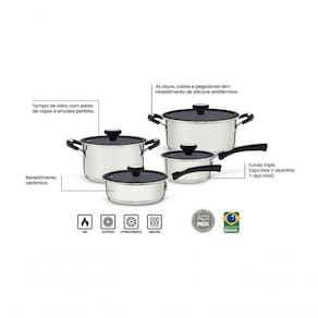 Os entusiastas da culinária concordam: além de ingredientes saborosos, uma refeição deliciosa exige utensílios de qualidade. O Jogo de Panelas Tramontina Solar Ceramic em Aço Inox Fundo Triplo, com revestimento interno cerâmico na cor grafite e cabos/alças de silicone, é a combinação perfeita de praticidade e . Essas peças são altamente duráveis, com revestimento cerâmico que preserva a umidade dos alimentos, resultando em um cozimento com menos gordura, mais rápido e eficiente. O fundo triplo (aço inox + alumínio + aço inox) distribui o calor de maneira uniforme, garantindo um cozimento homogêneo. As alças, cabos e pegadores têm revestimento em silicone antitérmico, proporcionando um manuseio mais confortável e . Todas as peças incluem tampa de vidro com saída de vapor e encaixe perfeito. O conjunto é com fogões a gás, elétricos, vitrocerâmicos e por indução, e pode ser facilmente limpo na máquina de lavar louça.