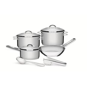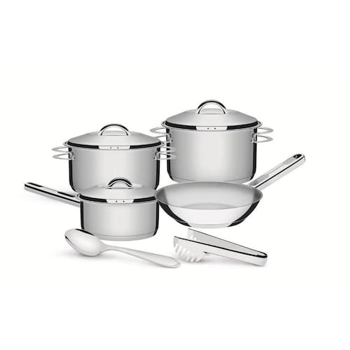 Composição - 01 Panela 16 cm Solar;01 Caçarola rasa 20 cm Solar;01 Caçarola funda 20 cm Solar;01 Frigideira sem tampa 20 cm Allegra;01 Colher para arroz;0 Pegador para massa.