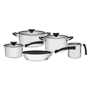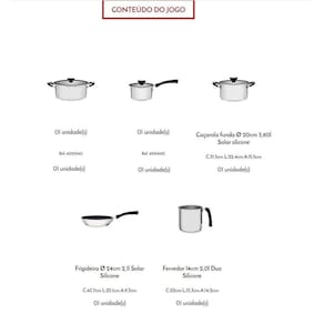 Jogo de Panelas Tramontina Solar Silicone em Aço Inox com Fundo Triplo 5 Peças Cor: Prateado O jogo de panelas Tramontina Solar Silicone em aço inox com fundo triplo 5 peças é a escolha perfeita para garantir o sucesso de todas as suas refeições e deixar sua cozinha ainda mais completa. Suas peças são desenvolvidas em aço inox e contam com fundo triplo (aço inox + alumínio + aço inox), características que juntas, as tornam altamente duráveis e proporcionam o cozimento dos alimentos de maneira rápida e uniforme. O jogo pode ser utilizado em diversos tipos de fogões, é fácil de limpar e vai otimizar sua rotina na cozinha Conteúdo da Embalagem:- 1 Caçarola Rasa 24cm 4,7 Litros Solar silicone- 1 Caçarola Funda 20 cm 3,6 Litros- 1 Panela 16 cm 1,80 Litros- 1 Frigideira 24 cm 2,10 Litros- 1 Fervedor 14 cm 2,0 Litros Mais saudável: por ser feita de aço inoxidável, a panela Tramontina não libera nenhum tipo de resíduo nas suas receitas. Fácil de usar: uma panela prática para todas as suas receitas e que faz bonito em qualquer tipo de fogão: gás, elétrico, vitrocerâmico e indução. tampa de vidro com saída de vapor e encaixe perfeito. As alças, cabos e pegadores tem revestimento em silicone antitérmico tornando a pega mais macia e confortável. Mais durável: o inox Tramontina é uma matéria-prima nobre, resistente e que vai fazer bonito por muito mais tempo na cozinha. Economiza tempo e energia: o segredo está no fundo triplo (aço inox + alumínio + aço inox), que distribui o calor uniformemente, proporcionando um cozimento mais rápido. Por isso, você pode manter o fogo baixo durante todo o preparo e, assim, poupar energia. Fácil de limpar: deixar sua panela brilhando é simples, você só precisa de água, sabão e uma esponja macia. Se preferir, é só colocar na máquina de lavar. A capacidade volumétrica máxima para cozimento é de 3/4 da capacidade total da peça. Antes de utilizar o produto, remover as eventuais etiquetas e lavar com água quente e detergente. Use uma fonte de calor brando para evitar que o alimento grude no fundo da panela. O fundo triplo distribui uniformemente o calor, não sendo necessário o fogo alto. E, além disso, você economiza energia. Quando a panela for utilizada no fogão a gás, a chama não deve ultrapassar a base da panela. No caso de uso de chapa elétrica, a chapa deverá ter diâmetro igual ou inferior ao da panela. Sempre dissolva o sal em água fervendo ou com os alimentos, mexendo os ingredientes no início do cozimento. Não aqueça o alimento colocando uma panela do mesmo diâmetro sobre a outra. Esse procedimento é perigoso, pois cria vácuo e impossibilita a retirada do mesma. Se a tampa da panela de aço inox Tramontina ficar presa pelo efeito do vácuo durante o resfriamento, basta puxar ou aquecer novamente até neutralizar o efeito do vácuo. O cabo de inox aquece durante o cozimento. Aconselhamos o uso de luvas durante o manuseio. Alguns alimentos que possuem amido, como massa e arroz, poderão deixar manchas na parte interna da panela durante o cozimento. Para remover facilmente as manchas, passe um pano umedecido com suco de limão ou vinagre, ou use a Pasta para Polir e Remover Manchas Tramontina.