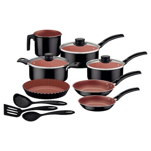 Jogo De Panelas Tramontina Turim 10 Peças Preto Em Alumínio Antiaderente Starflon Max Corpo de alumínio com espessura que proporciona cozimento rápido e uniforme.Revestimento interno de antiaderente Starflon Max que não gruda, é fácil de limpar, mais durável e não é prejudicial à saúde, pois é livre de PFOA.Revestimento externo de poliéster.Tampas de vidro temperado com borda de aço inox.Cabos, alças de baquelite antitérmico e pegadores de nylon que oferecem segurança durante o manuseio.Utensílios de nylon que permitem uso em temperaturas de até 180 C e cabos com furo passante possibilitando que sejam pendurado na sua cozinha. Linha/Coleção - Turim Modelo - 27899299 Material - Alumínio Cor - Preto Acabamento - Preto Tampa(s) - Vidro Alças e Cabos - Baquelite Quantidade de Peças - 10 É kit de fábrica - Sim Revestimento Interno - Antiaderente Starflon Max Revestimento Externo - Antiaderente Starflon Max Com revestimento antiaderente - Sim Cabo perfurado - Sim Fundo triplo - Não Composição - 1 Caçarola 18 cm 2 L ;1 Colher para Servir ;1 Espumadeira ;1 Espátula ;1 Fervedor 12 cm 1,1 L;1 Forma para Torta e Bolo 24 cm 1,4 L;1 Frigideira 16 cm 0,4 L;1 Frigideira 20 cm 0,8 L;1 Panela 16 cm 1,4 L;1 Panela 18 cm 2,0 L. Tampa(s) com saída de de vapor - Sim Podem ser utilizadas nos fogões - Gás, Elétrico e Vitrocerâmico resistência elétrica Adequado para fogão de indução - Não É adequado para lava-louças - Sim Marca - Tramontina Mais Informações - Corpo de alumínio com espessura que proporciona cozimento rápido e uniforme.Revestimento interno de antiaderente Starflon Max que não gruda, é fácil de limpar, mais durável e não é prejudicial à saúde, pois é livre de PFOA.Revestimento externo de poliéster.Tampas de vidro temperado com borda de aço inox.Cabos, alças de baquelite antitérmico e pegadores de nylon que oferecem segurança durante o manuseio.Utensílios de nylon que permitem uso em temperaturas de até 180 C e cabos com furo passante possibilitando que sejam pendurado na sua cozinha. Recomendações de Uso - A capacidade volumétrica máxima para cozimento é de 3/4 da capacidade total da peça.Posicione os cabos dos utensílios voltados ao centro do fogão.Em fogões com grade, centralize a peça e alinhe o cabo com a grade.Utensílios quentes devem estar fora do alcance das crianças.Para descarte dos produtos e embalagens siga as orientações de reciclagem vigentes. Peso - 2.65 kg Garantia - 3 meses para vícios ou defeitos de fabricação EAN - 7891112311831 Garantia de fabricante - 12