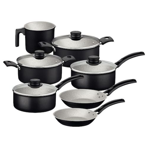 Sua cozinha merece contar com toda a qualidade e eficiência do jogo de panelas Tramontina Turim em aluminio com revestimento interno e externo em antiaderente Starflon Max preto 07 peças. Desenvolvidas com corpo de alumínio e revestimento interno e externo de antiaderente Starflon Max, suas peças são essenciais para uso diário e proporcionam um cozimento rápido e uniforme, sem que os alimentos grudem em sua superfície. A caçarola e as panelas vem com tampas de vidro temperado com bordas de aço inox e contam com cabos, alças e pegadores de nylon, que oferecem toda a segurança e conforto que você merece durante o manuseio. O jogo é muito prático e versátil, podendo ser levado à máquina de lavar louças e utilizado nos fogões a gás, elétricos e vitrocerâmicos. Dimensões da embalagem: 733x435x130 mm Peso: 3,05Kg