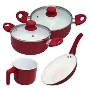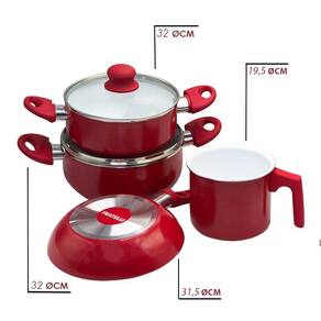 Jogo de Panelas Vermelho de Alumínio com Revestimento Cerâmico e Cabo de Baquelite - 4 Peças Com um conjunto completo de tamanhos e utilidades, você terá todas as ferramentas necessárias para preparar deliciosos pratos para toda a família.Trazendo um visual moderno e ao mesmo tempo sofisticado, esse conjunto conta com 02 caçarolas com tampa de vidro com tamanhos diferentes, 01 frigideira e 01 leiteira, dando diversas possibilidades para suas receitas. Feito de materiais de alta qualidade, combinando o melhor dos dois mundos: o alumínio, conhecido por sua excelente condução de calor e resistência, e o revestimento cerâmico, que garante que você possa cozinhar com menos óleo, mantendo o sabor e a textura dos alimentos, também proporciona uma superfície antiaderente e livre de produtos químicos, facilitando na hora da limpeza, bastando apenas o enxágue e as panelas estarão prontas para a próxima receita. Além disso, conta com cabo de baquelite, que possui uma excelente resistência, garantindo um manuseio seguro com a panela e evitando possíveis acidentes. -Capacidade máxima de cozimento 2/3 da capacidade total da forma/assadeira. CUIDADOS: -Não utilizar espátulas, colheres, garfos, facas ou outros utensílios metálicos para manusear ou raspar resíduos da assadeira e formas;-Para longevidade do produto é recomendado o uso de colheres e utensílios de nylon, borracha, silicone ou madeira;-Nunca leve as assadeiras e formas ao fogo sem alimento em seu interior por um período prolongado, o superaquecimento pode causar dano irreversíveis ao produto. ESPECIFICAÇÕES:Material: Alumínio, Revestimento cerâmico e baquelite.Dimensões:-Caçarola maior: Diâmetro: 32cm x Larg.: cabo ao outro: 35cm x Profundidade: 10cm-Caçarola menor: Diâmetro: 29cm x Larg.: cabo ao outro: 31,5cm x Profundidade: 8,5cm -Leiteira: Diâmetro: 19,5cm x Profundidade: 11cm-Frigideira: Diâmetro: 31,5cm x Comprimento: 34,5cm x Profundidade: 6cmCapacidade:-Caçarola maior: 2,2 litros-Caçarola menor: 2 litros-Leiteira: 1,6 litros-Frigideira: 1 litroPeso:-Caçarola maior: Aprox. 530g-Caçarola menor: Aprox. 345g-Leiteira: Aprox. 270g-Frigideira: Aprox. 265gCor: Vermelho CONTÉM:01 JOGO DE PANELAS VERMELHO DE ALUMÍNIO COM REVESTIMENTO CERÂMICO E CABO DE BAQUELITE - 4 PEÇAS