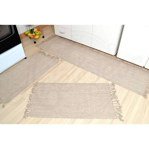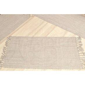 Jogo de tapetes retangular feitos em tear, na cor bege mesclado, com detalhes em franjas nas laterais.