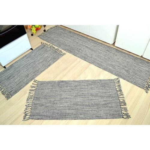Jogo de tapetes fabricado em tear, na cor preta mesclada, com franjas em duas laterais.