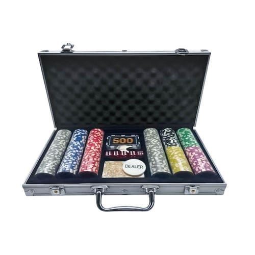 100x Fichas [Cinza] 50x Fichas [Vermelho] 50x Fichas [Azul] 25x Fichas [Verde] 25x Fichas [Amarelo] 25x Fichas [Rosa] 25x Fichas [Preta] 1x Bloco de cartas- 500 (valor) 1x Bloco de cartas- 1000 ( valor) 5x Dados 2x Chaves da maleta
