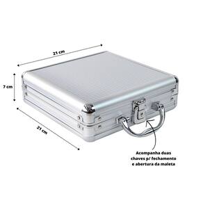 Conteúdo da emlagem: 01- Maleta 02- Jogos de baralho 01- Manual de instrução 02- Chaves 100- Fichas de poker (1,5,25 e 50)