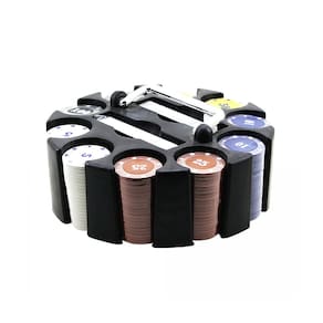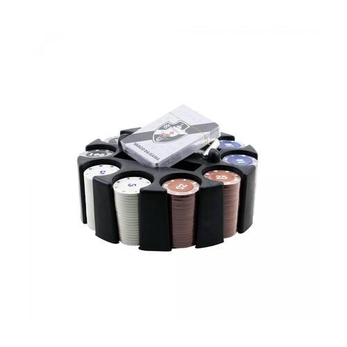 Giratório Com alça de plástico para carregar Com fichas numeradas de 5, 10, 25, 50 e 100 - 40 de cada Ficha Dealer Com 2 Baralhos do Vasco Material: Plástico Fichas e Base Tamanho das Fichas: 3,9cm de Diâmetro x 0,3cm de Largura Tamanho do "Porta Fichas": 19,5cm de Diâmetro x 10cm de Altura Com base e alça