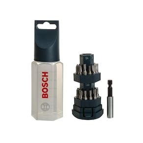 Descrição do Produto: Jogo de Bits para Parafusadeira conta com 25 peças feitas em aço resistente, oferecendo maior durabilidade. As peças são acondicionadas em um estojo plástico com visor transparente e compartimento para cada item, permitindo organização e praticidade. Ideal para utilização em parafusadeiras elétricas ou manuais de qualquer marca. Composto por: : Punho magnético universal :: 24 pontas de 25 mm : 2 x Fenda 4/6/7 2 x Phillips 1/2/3 2 x Pozidriv 1/2/3 2 x Tork 20/25/30 - Garantia:6 Meses Ref.: BOSCH-2607017404-000 Marca.:BOSCH Ean: 6949509227065