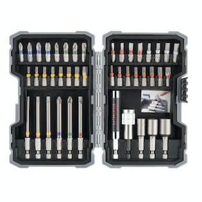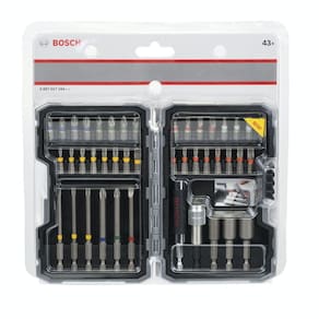 Conjunto de 43 pontas, bits e soquetes de parafusar com suporte universal de aperto rápido e suporte universal magnético. Possui um acessório muito interessante que trava a cabeça do parafuso impedindo que a ponta escape e risque a madeira.Acompanha estojo plástico para armazenamento e transporte. Todas as pontas são imantadas. Composição:* 32 Bits com 25mm, sendo:4 Tipo Phillips: PH1, PH2 (x2) e PH34 Tipo Pozidriv: PZ1, PZ2 (x2) e PZ34 Tipo Fenda: 3, 4, 5 e 6 mm4 Tipo Allen: 3, 4, 5 e 6 mm8 Tipo Torx: 10, 15, 20 (x2), 25, 27, 30 e 408 Tipo Torx com guia: 10, 15, 20 (x2), 25, 27, 30 e 40---------------------------------------------------------------------------* 6 Bits com 75mm, sendo:3 Tipo Torx: T15, T20 e T251 Tipo Phillips: PH21 Tipo Pozidriv: PZ21 Tipo Fenda: 5mm---------------------------------------------------------------------------* 3 Bits tipo Canhão: 6, 8 e 10 mm* 1 Suporte magnético universal de aperto rápido* 1 Adaptador magnético para bitsPeso: 700 gr.Codigo Bosch: 2607017164
