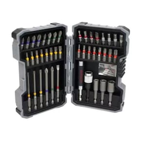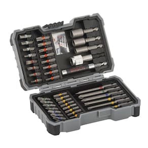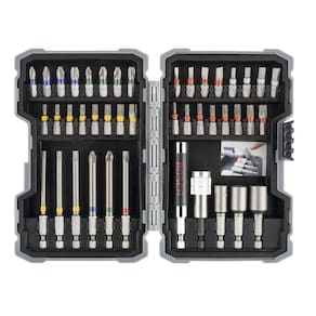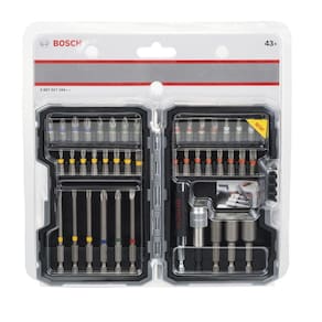 Conjunto de 43 pontas, bits e soquetes de parafusar com suporte universal de aperto rápido e suporte universal magnético. Possui um acessório muito interessante que trava a cabeça do parafuso impedindo que a ponta escape e risque a madeira.Acompanha estojo plástico para armazenamento e transporte. Todas as pontas são imantadas. Composição:* 32 Bits com 25mm, sendo:4 Tipo Phillips: PH1, PH2 x2 e PH34 Tipo Pozidriv: PZ1, PZ2 x2 e PZ34 Tipo Fenda: 3, 4, 5 e 6 mm4 Tipo Allen: 3, 4, 5 e 6 mm8 Tipo Torx: 10, 15, 20 x2 , 25, 27, 30 e 408 Tipo Torx com guia: 10, 15, 20 x2 , 25, 27, 30 e 40---------------------------------------------------------------------------* 6 Bits com 75mm, sendo:3 Tipo Torx: T15, T20 e T251 Tipo Phillips: PH21 Tipo Pozidriv: PZ21 Tipo Fenda: 5mm---------------------------------------------------------------------------* 3 Bits tipo Canhão: 6, 8 e 10 mm* 1 Suporte magnético universal de aperto rápido* 1 Adaptador magnético para bitsPeso: 700 gr.Codigo Bosch: 2607017164