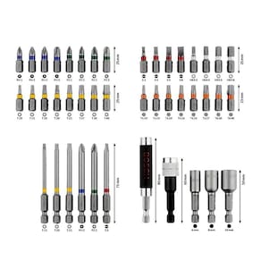 32 pontas 25mm: PH1, 2x PH2, PH3, PZ1, 2x PZ2, PZ3, S3, S4, S5, S6, Allen 3/4/5/6mm, T10, T15, 2x T20, T25, T27,T30, T40, Tork com guia T10, T15, 2x T20, T25, T27, T30, T40