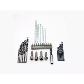 CONTEÚDO DO KIT: • 07 brocas para metal HSS-R de 2/3/3/3,2/4/4,2/5 mm • 05 brocas para pedra de 4/5/6/7/8 mm • 06 brocas para madeira de 3/4/5/6/7/8 mm • 10 bits, C = 25 mm, PH 1/2/3, PZ 1/2, SL 4/6/7, T 20/25 • 01 suporte universal magnético • 03 chaves de caixa para parafusos sextavados 7/8/10 mm • 01 escareador