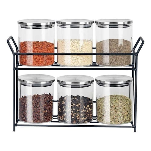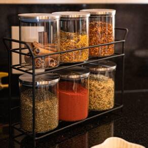 Lindo jogo de porta temperos em vidro borossilicato e tampa hermética em aço inox, com ;suporte de metal, é ;tendência para ambientes funcionais, uma perfeição. Armazena e protege seus temperos de forma adequada (sal, pimenta, colorau, cúrcuma, páprica, ervas, orégano), condimentos e especiarias em geral, podendo também serem s para guardar castanhas ou outros alimentos. Possuem fechamento hermético que bloqueia a entrada do ar, isso ajuda a manter os alimentos frescos, com sua textura e sabor por mais tempo e evitando com que percam seu aroma, trazendo beleza e organização para a sua cozinha.