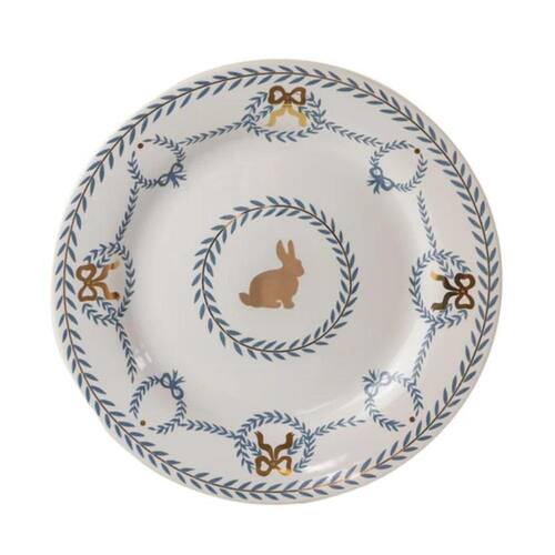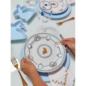 As datas especiais merecem uma produção especial. Trouxemos os lindos pratos COELHO GOLD para você comemorar com sua família. Material: Peças em Cerâmica faiança, artesanal de fabricação nacional, não refratária, produzida de acordo com as tradições da Indústria ceramista de Alcobaça / Portugal. Tamanho: 27x27x3 cm Cor: branco, azul e dourado Cuidados com a peça: Não deixar gordura, lavar com a esponja do lado macio. Kit: 6 pratos rasos