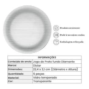Super resistente o Jogo de pratos em vidro fundo 6 peças 22,4 cm Transparente vai super bem com qualquer tipo de decoração. Graças ao seu aspecto clássico que combina com tudo, ele vai ornar perfeitamente com os demais utensílios que você tem. Ele vai ser perfeito para usar no dia a dia ou quando for receber visitas em casa e suas linhas no lado exterior do prato traz sofisticação e charme. Fabricado em vidro temperado de qualidade, ele apresenta uma excelente resistência e durabilidade.Itens inclusos;6 pratos fundo em vidro temperado 22,4 cm Diamante TransparenteInformações Importantes;Medidas aproximadas - 22,4 x 3,1cm Diâmetro x Altura Composição - Vidro temperadoCor - TransparenteValidade - IndeterminadaConteúdo de envio - 1 unidade do Jogo de pratos em vidro fundo 6 peças 22,4 cm TransparenteFabricante - Nadir FigueiredoProduto 100% nacionalDURALEX é a linha de mesa que complementa o ambiente com harmonia. Uma linha tradicional e de confiança, que faz parte da história de seus consumidores. Os pratos, em vidro temperado, são resistentes a impactos e pequenas quedas. Pode ir ao micro-ondas, freezer, geladeira e lava-louças. A linha é composta por pratos, xícaras e saladeiras.Mais Informações;Evite pancadas ou impactos pois podem trincar, lascar ou danificar o produto.Ao lavar use de preferência detergente neutro, esponja macia e enxague com água em abundância, evitando o uso de abrasivos, como palha de aço ou saponáceo.Pode ser levado ao microondas.Pode ser levado ao freezer e geladeira.Pode ser levado a lava-louças.Evite riscá-lo com utensílios pontiagudos.Não coloque sobre a chama do fogão, em forno convencional ou outra fonte direta de calor.Uso em microondas somente para períodos curtos, para aquecimento.Não submeta à mudança brusca de temperatura. Jogo de pratos em vidro fundo 6 peças 22,4 cm Transparente