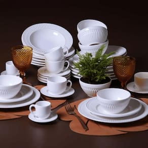 Estilo clássico e atemporal Bordas com leve relevo decorativo Cor branca neutra que combina com qualquer composição de mesa Formato funcional, ideal para diversos tipos de receitas